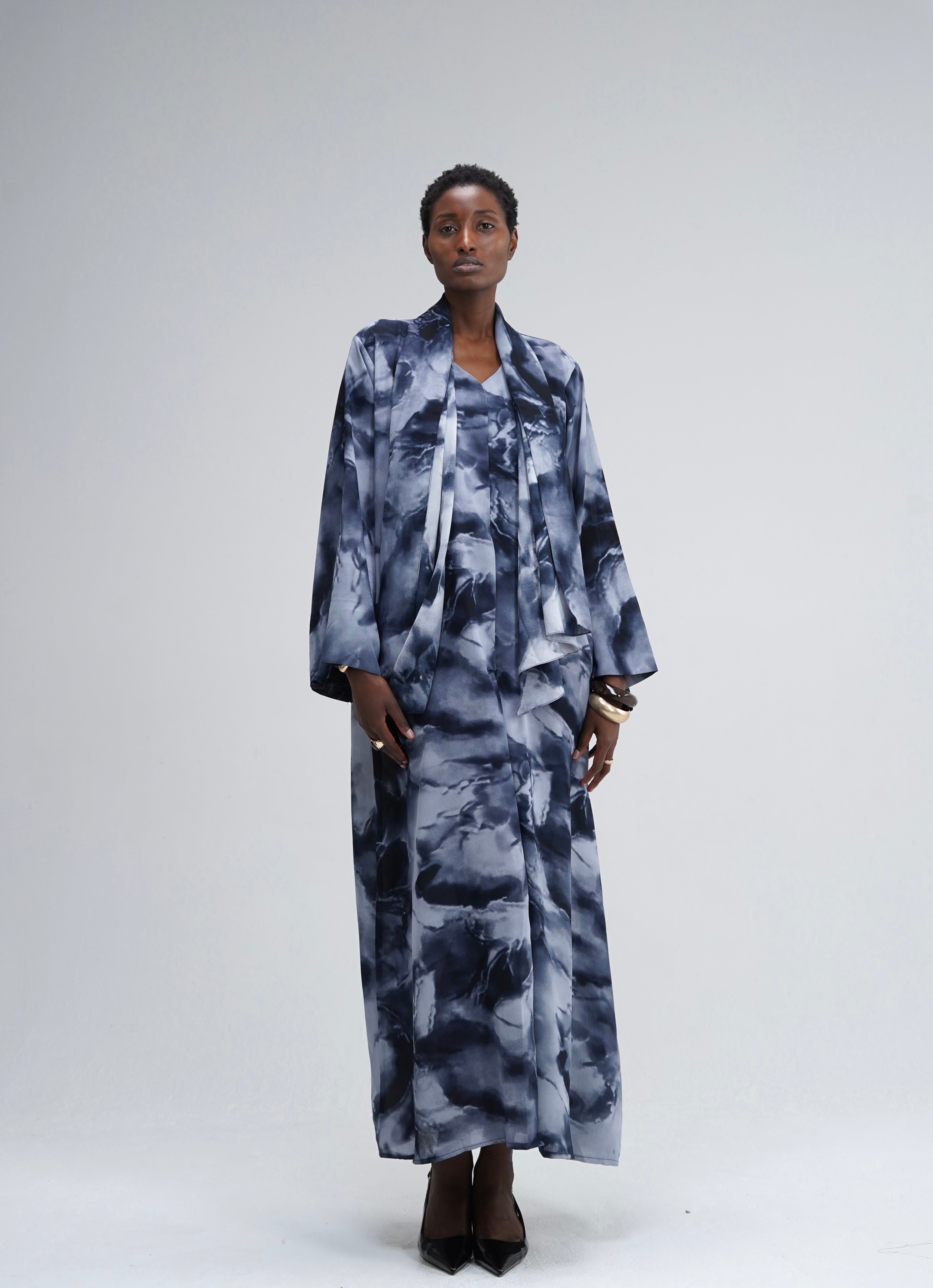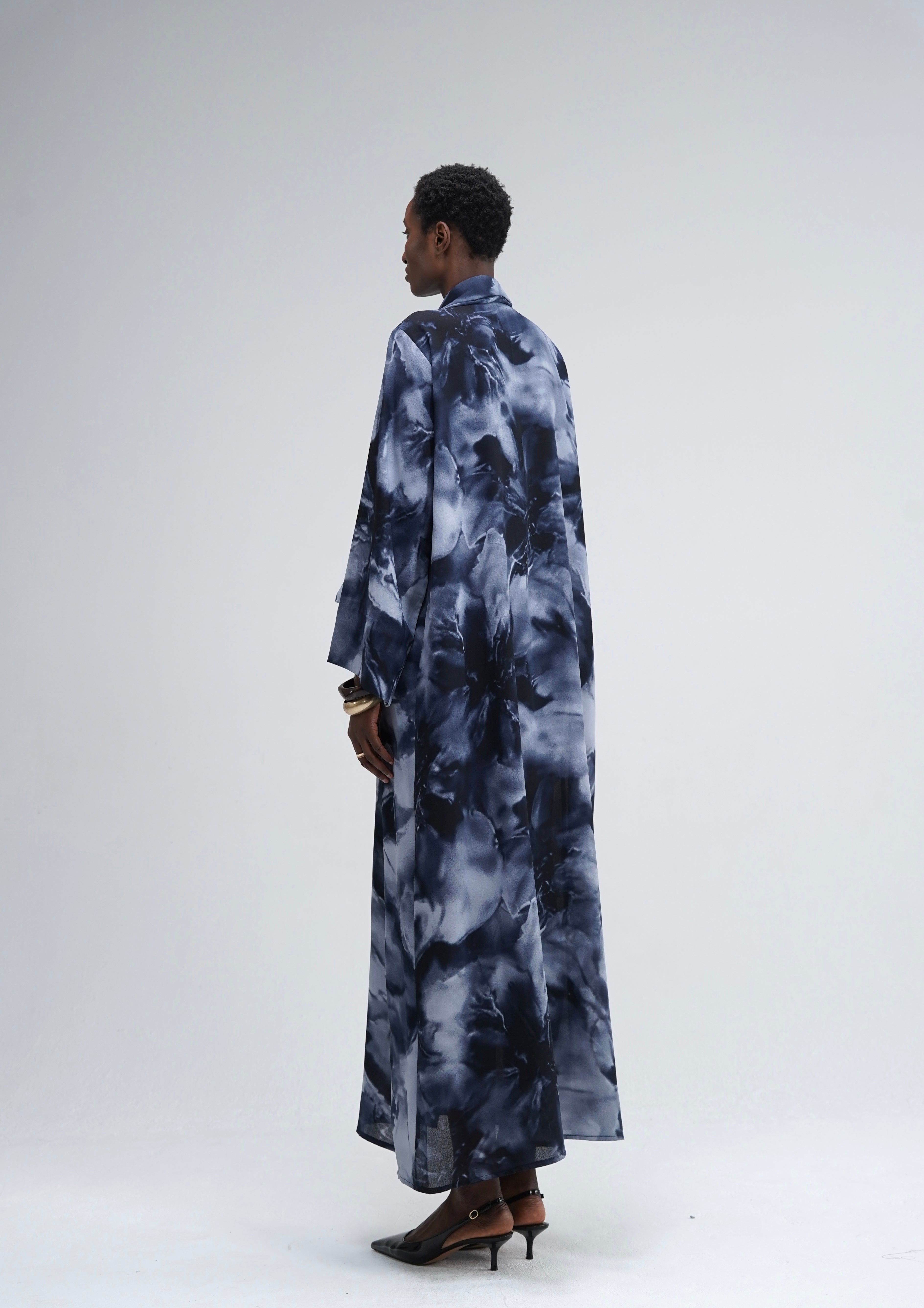 La Abaya Marble Veil revisite la silhouette classique avec un imprimé marbré aux nuances profondes de bleu et de gris. Son voile assorti confectionné dans le même motif crée un effet drapé naturel et structuré apportant une allure éditoriale et contemporaine.